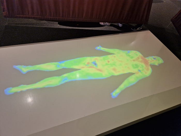 I watched as some children climbed onto the table and lay down on the projection. I found it interesting that those who are ready to know what death means will take what they need from it, but it can be completely ignored by those younger who don’t yet understand — instead made into a playful opportunity instead. The subtly I think is the key here and it was sensitively presented (as an abstract heat map rather than something more identifiable to the person’s likeness).